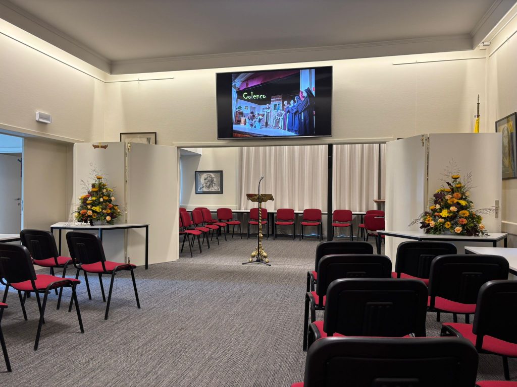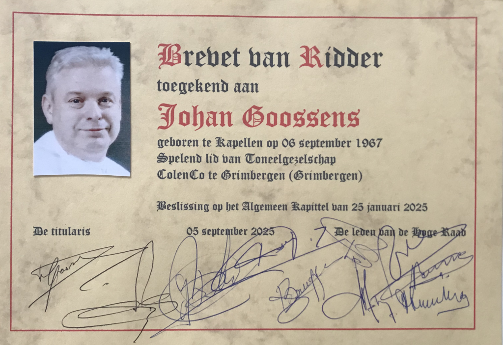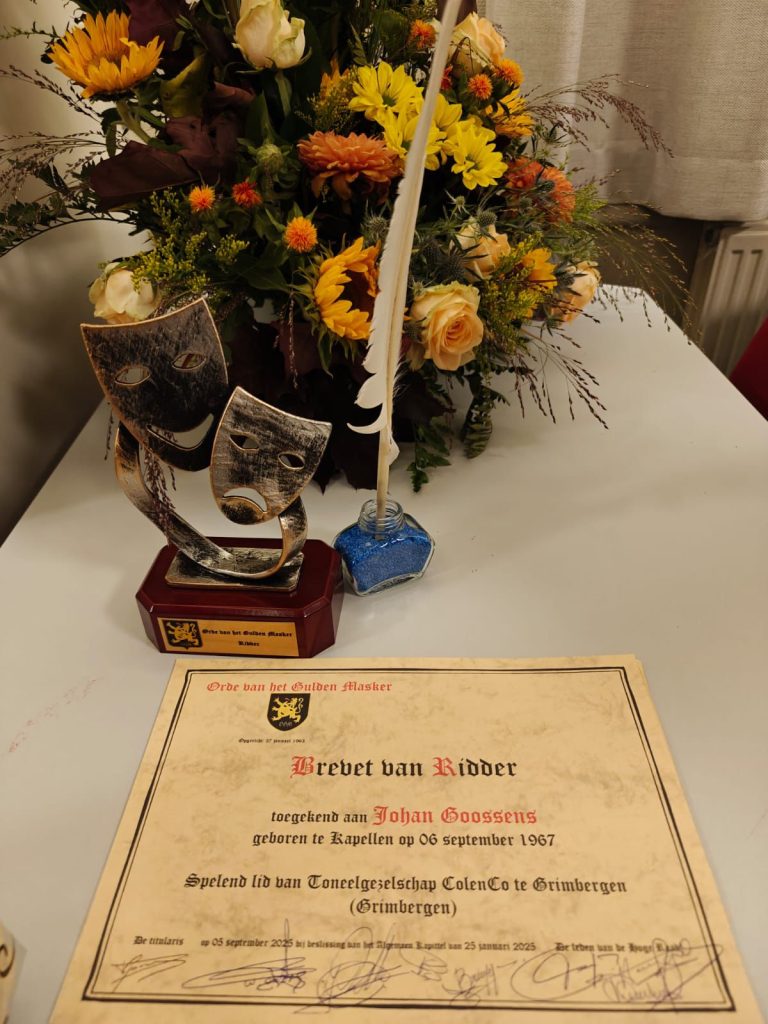Zo belandde Johan bij ColenCo en we hadden met een kleine delegatie de eer hem eerder dit jaar quasi onherkenbaar (en dit gaat niet over kledij of grime), maar als figuur als een bijna jeune-premier te zien dartelen op de scene. We hebben er van genoten en dat sterkte ons nog meer om zijn kandidatuur als ridder van het Gulden Masker volledig en volmondig te onderschrijven. Vandaag zijn we dus zeer verheugd als orde, dat we op deze memorabele plek een memorabele intronisatie kunnen meevieren. Ministers van staat, taatssecretarissen, schrijvers, notoire Brusselaars maar evengoed al meer dan honderdvijftig toneelliefhebbers die hun kunde, kunst, hart verknocht hebben aan het amateurtheater gingen al vooraf. Vandaag schrijven we met fierheid een nieuwe naam in ons ‘Gulden Boek’, de naam van pater Johan Goossens, een mens tussen de mensen goedlachs, gedreven, in de weer, altijd paraat en dus een ideale ridder om mee te nemen op de scène van het Vlaams Brabantse en Brusselse amateurtheater. Ik ben er van overtuigd dat “ons Heer dit ziet en goedkeurt’. Welkom in onze ridderschare, Johan.