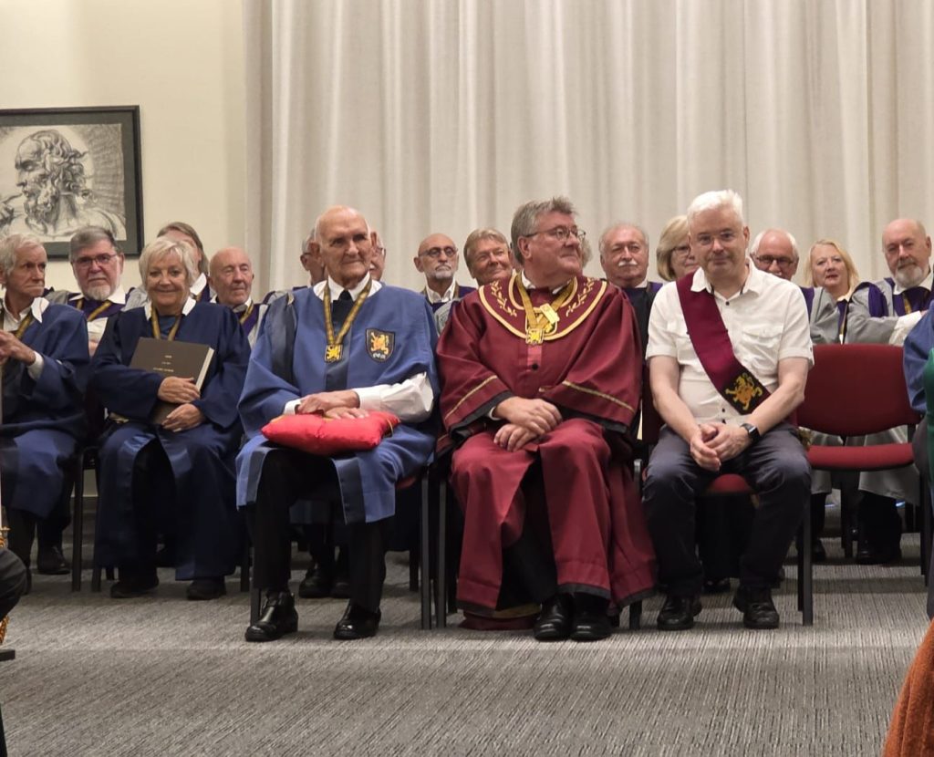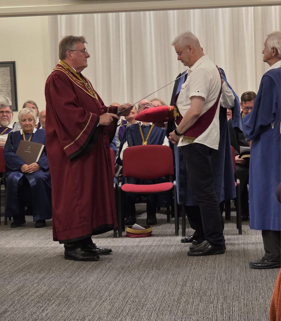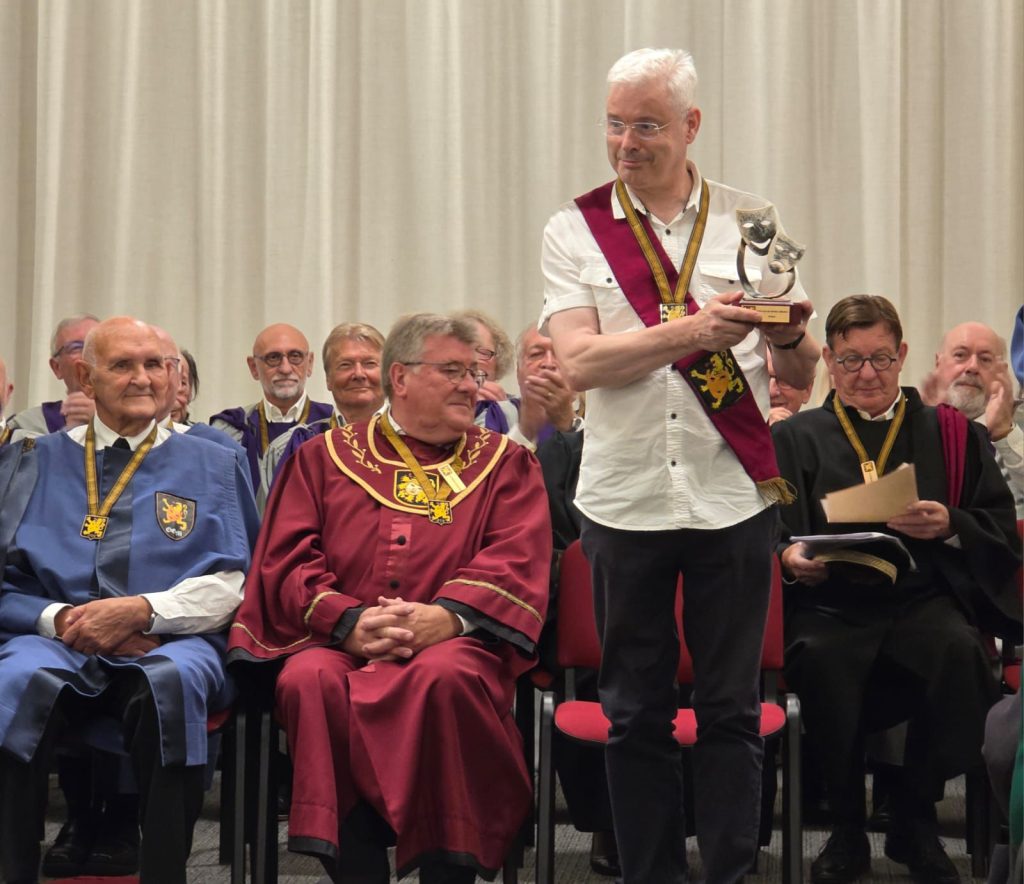 Kortom: voorwaar een zeer waardige en nobele ridder voor jullie genootschap. Om af te ronden—en met aandrang!—toch volgende oproep: leg vooral niet té veel beslag op uw nieuwe Ridder, want we hebben hem hier hard nodig.